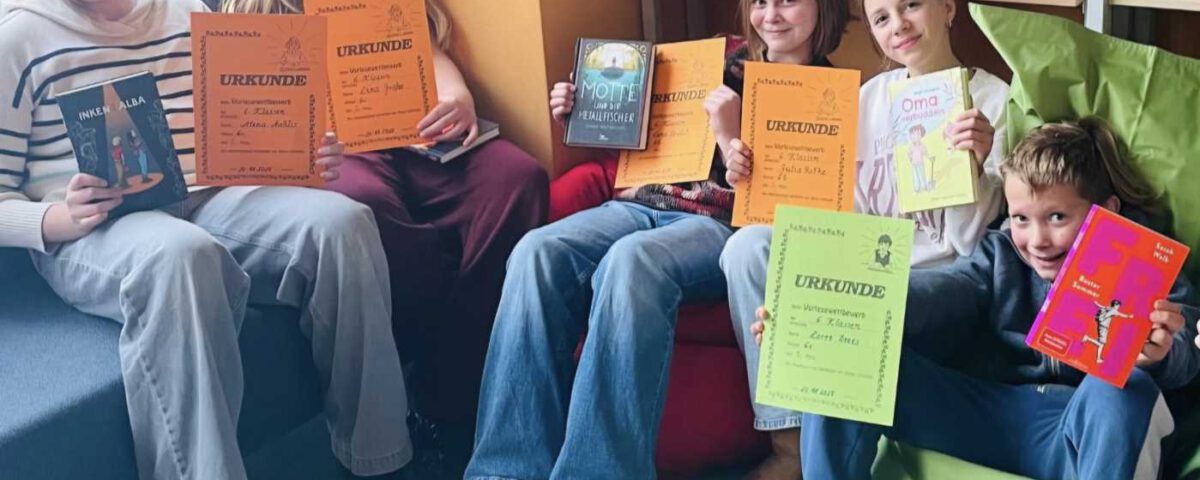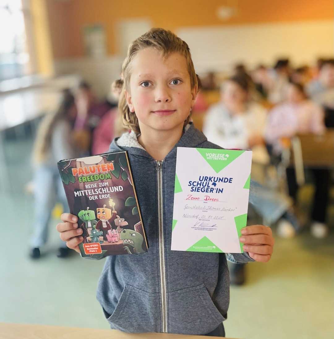 13.11.2025Am 20. November 2025 fand in der Mensa unserer Schule der diesjährige Vorlesewettbewerb der 6. Klassen statt. In einer gemütlichen Atmosphäre traten die Klassensiegerinnen und -sieger gegeneinander an und präsentierten spannende, lustige und berührende Textausschnitte. Die Jury hatte es nicht leicht, denn alle Teilnehmenden überzeugten mit großem Engagement und tollen Lesebeiträgen. Am Ende durfte sich der Schulsieger Zorro Drees über viel Applaus und eine Urkunde freuen. Es war ein gelungener Vormittag, der zeigte, wie viel Freude das Lesen machen kann.